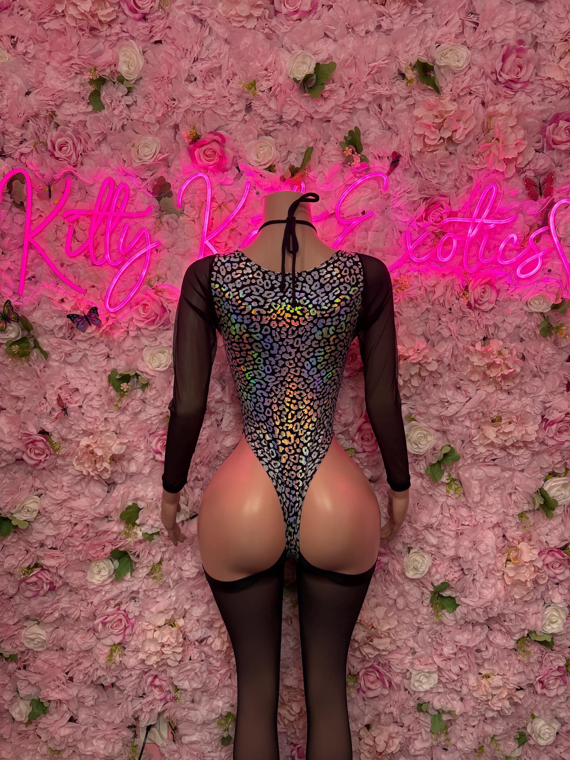 Bottle Girl One-Piece Bodysuit - Black Metallic Cheetah Design | Exotic Dancewear for Performers, Raves, & Festival Clothing