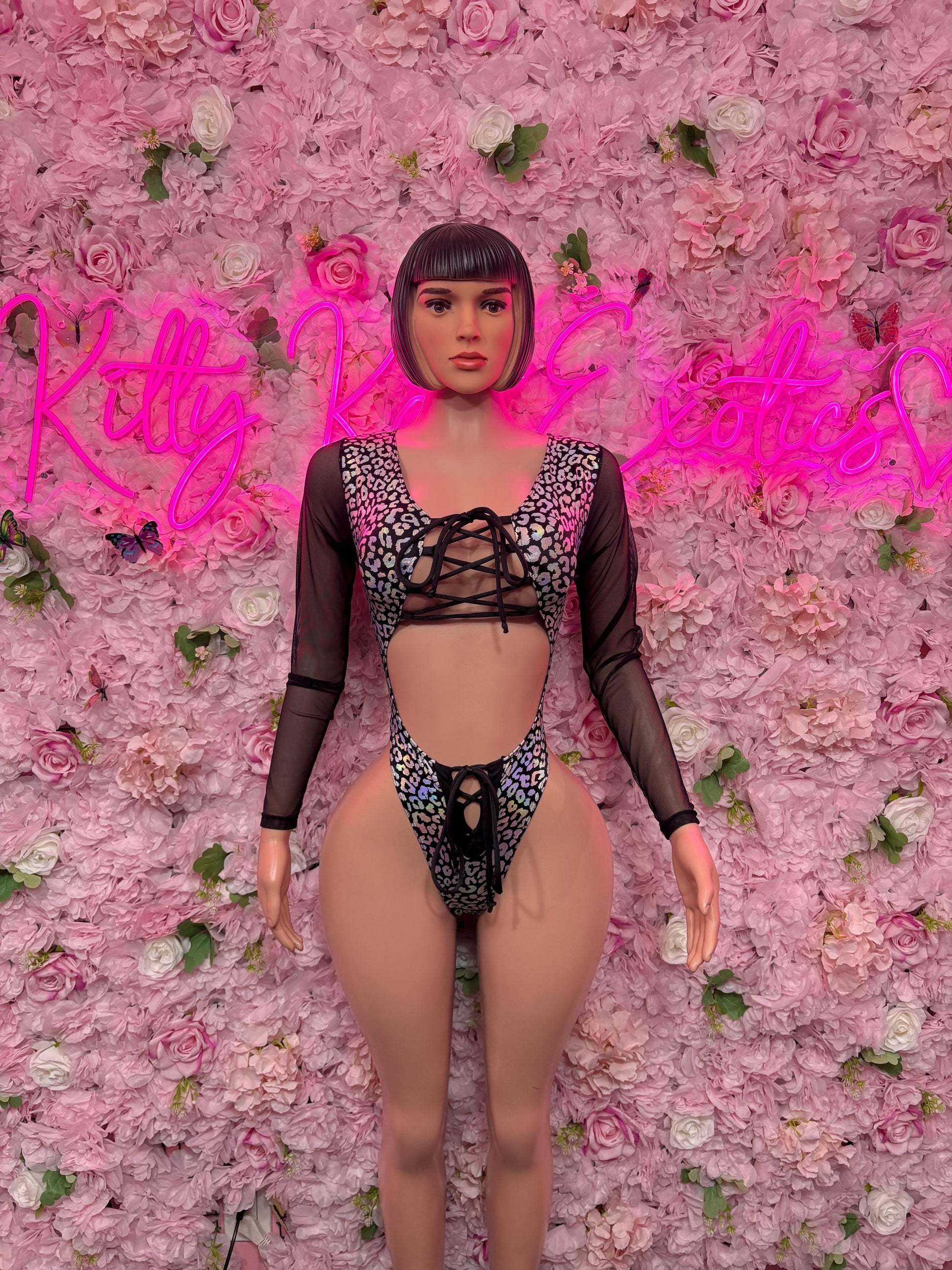 Bottle Girl One-Piece Bodysuit - Black Metallic Cheetah Design | Exotic Dancewear for Performers, Raves, & Festival Clothing