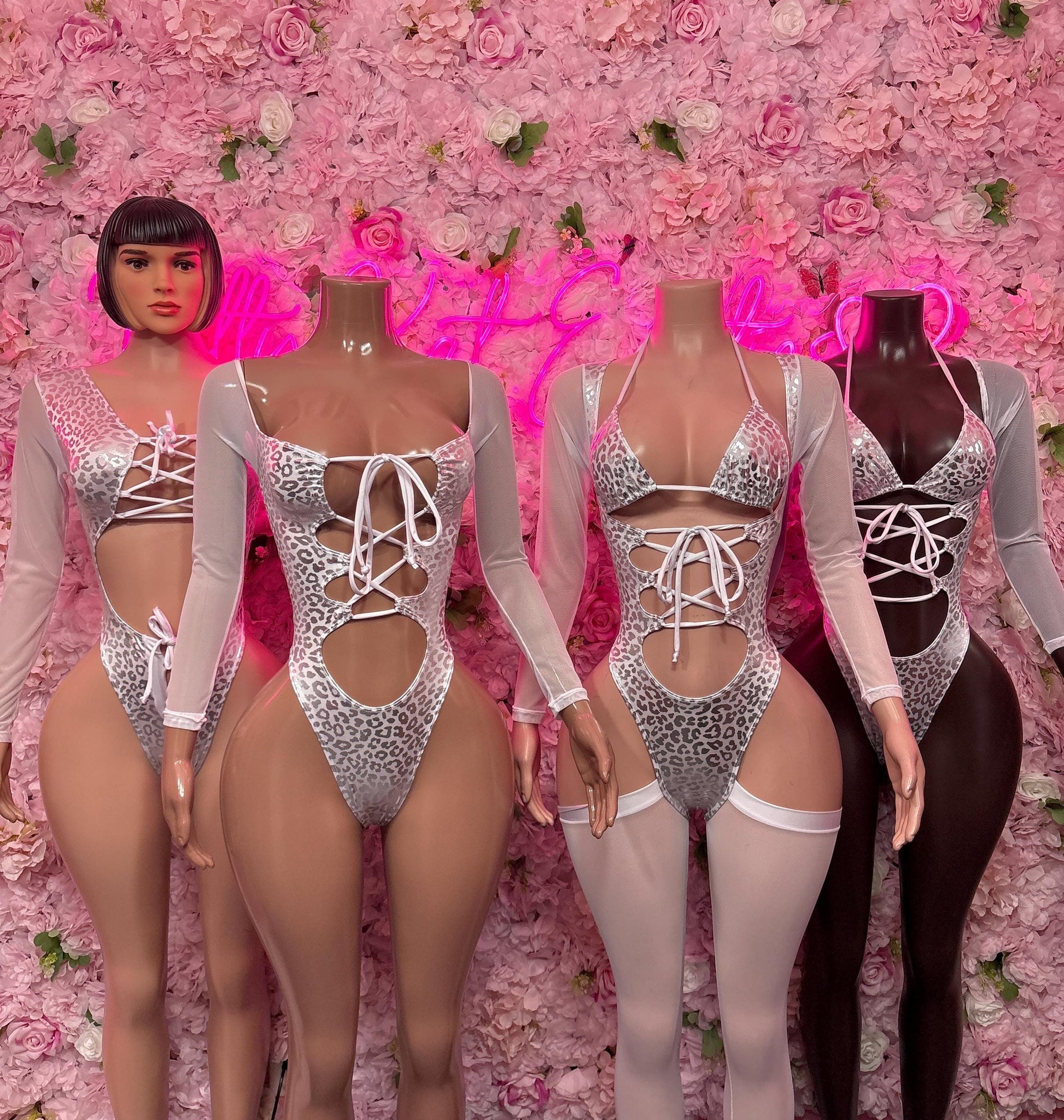 Bottle Girl One-Piece Bodysuit - White Metallic Cheetah Design | Exotic Dancewear for Performers, Raves