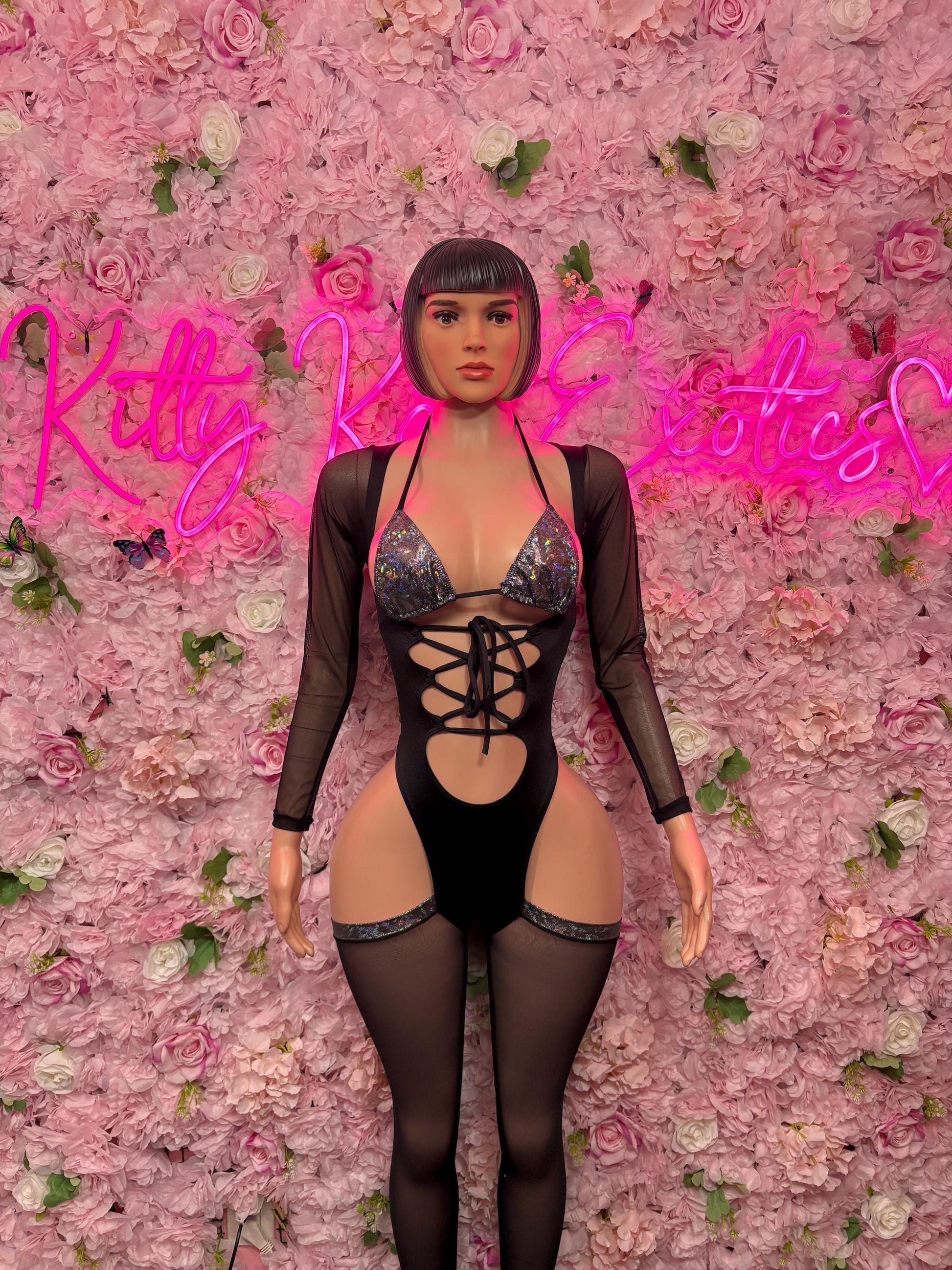 Bottlegirl Bartender Outfit One Piece Black Metallic Bodysuit - Exotic Dancewear