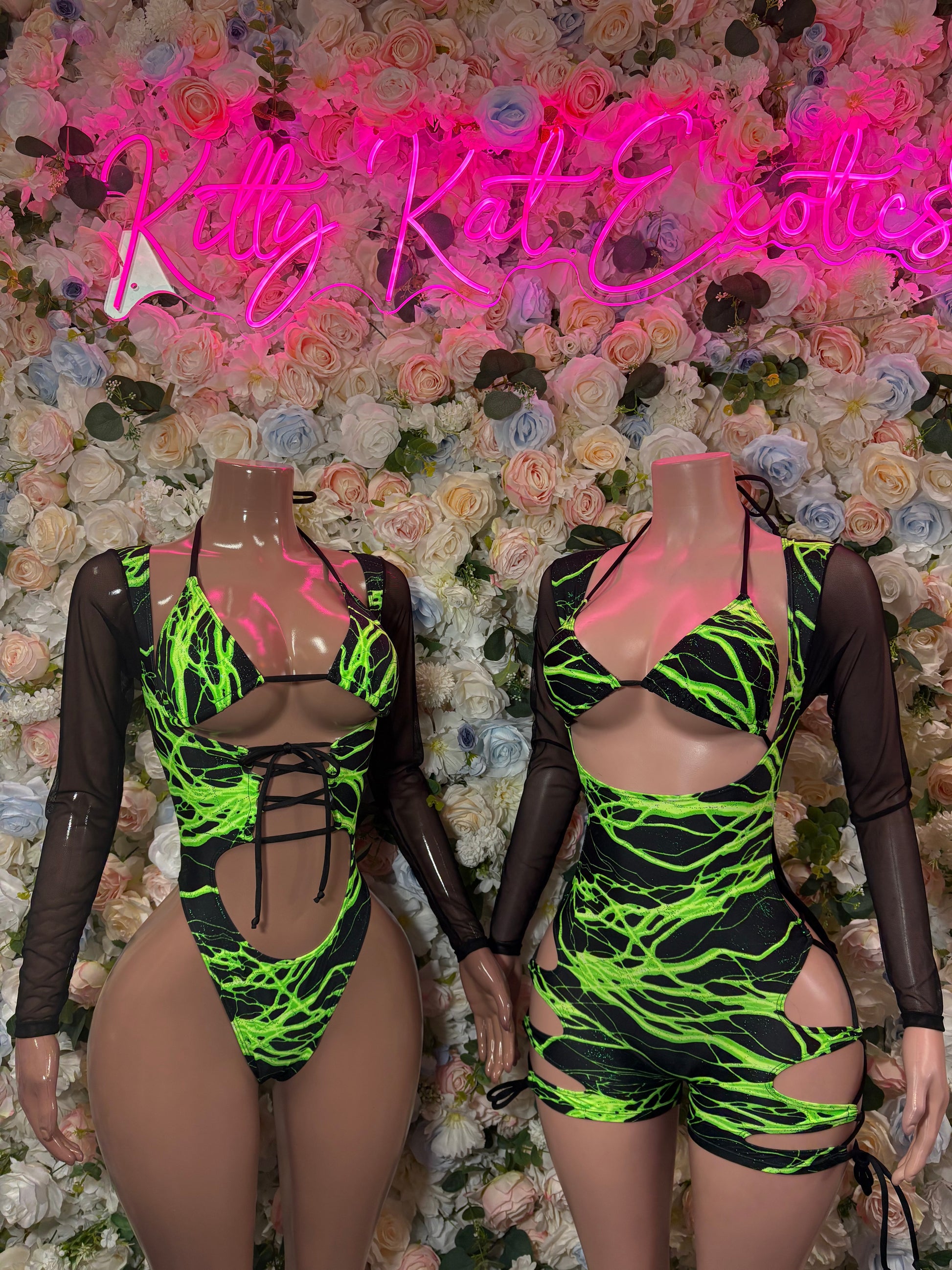 Bottlegirl One-Piece Bodysuit Green and Yellow Lightening - Custom Design | Exotic Dancewear for Performers, Raves, & Nights Out