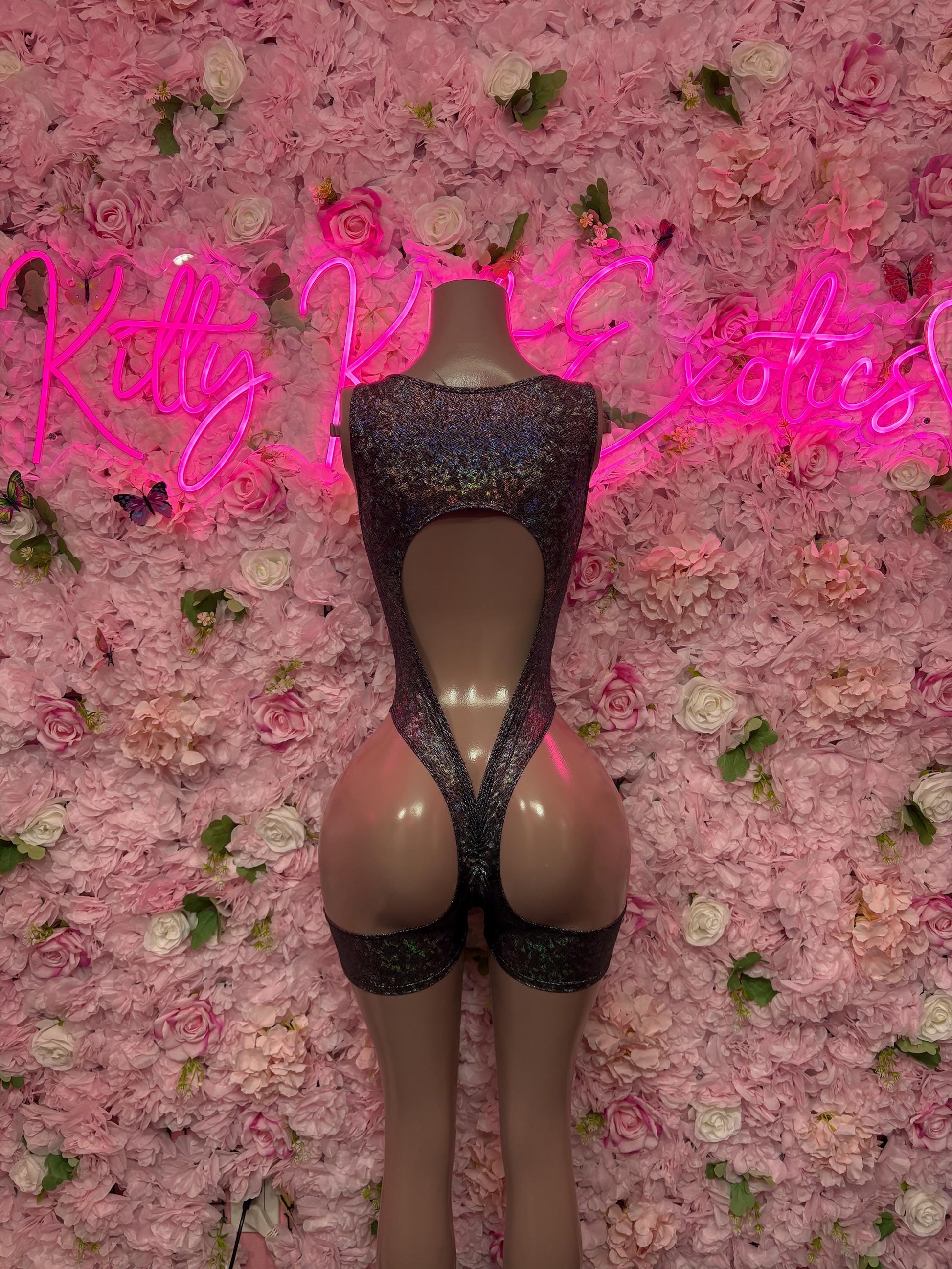 Bottle girl Outfit One-Piece Bodysuit - Black Metallic Hologram Design