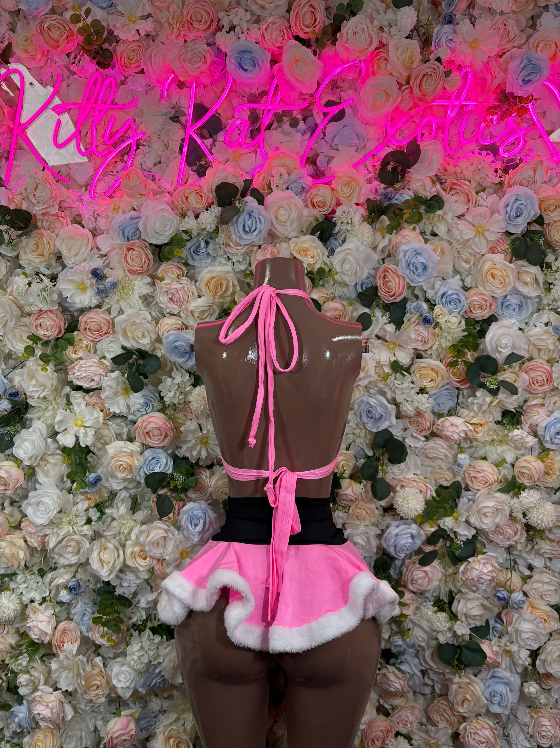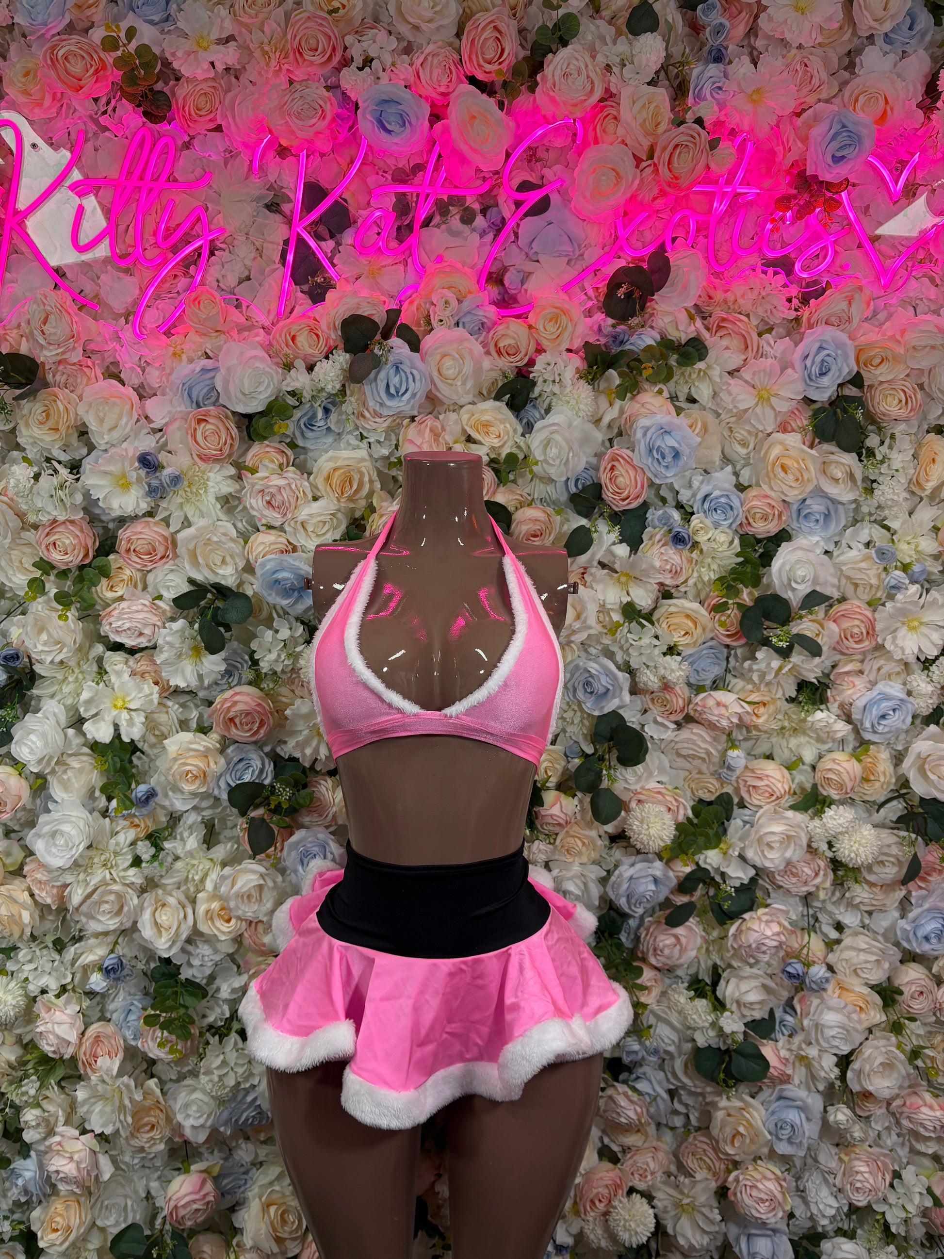 Christmas Pink Santa Holiday Outfit Two Piece Skirt Set Pink Santa Exotic Dancewear Costume Holiday Outfit