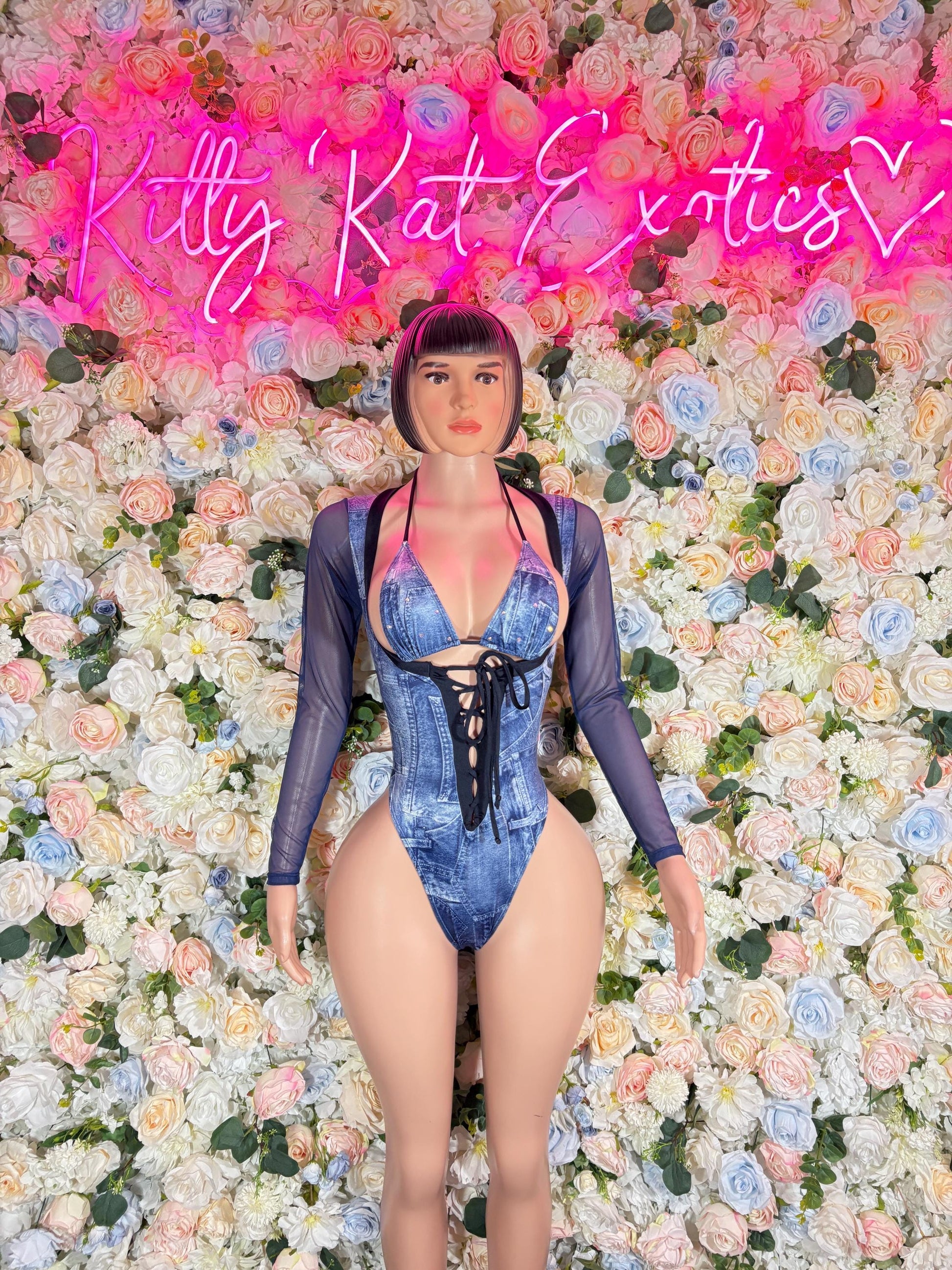 Denim Print Bottle Girl One-Piece Bodysuit - Custom Design | Exotic Dancewear for Performers, Raves, & Nights Out