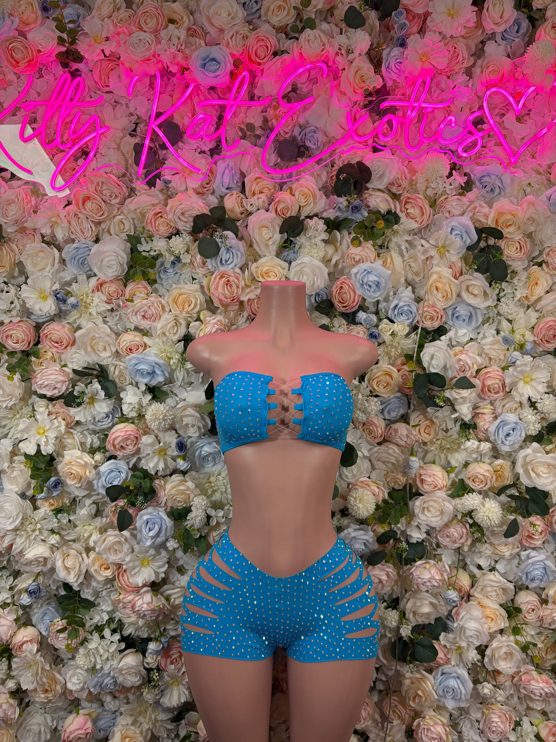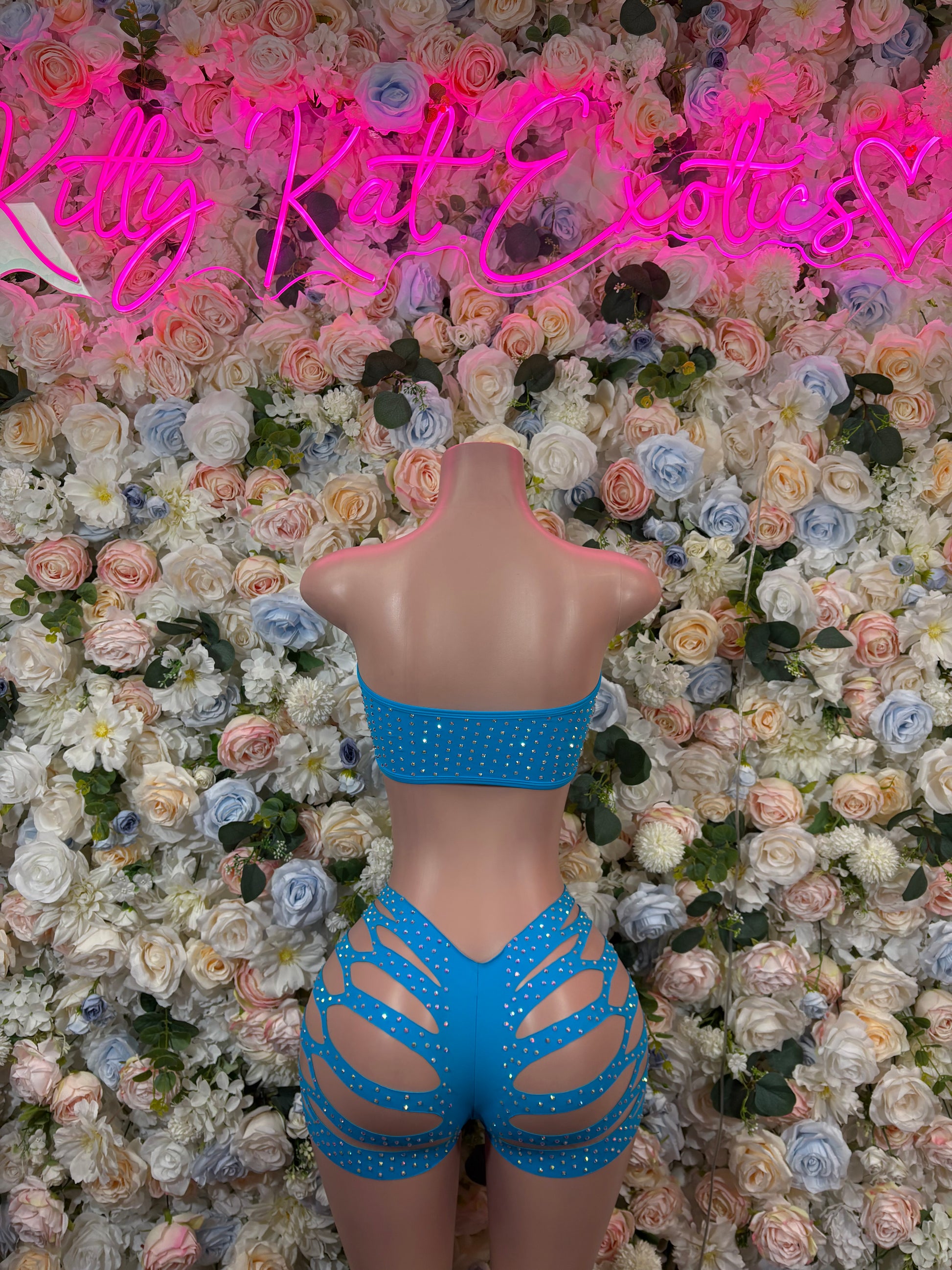 Exotic Dancewear Blue Rhinestone Two Piece set – Rave outfit, rave wear costume, pole dance lingerie, festival bikini