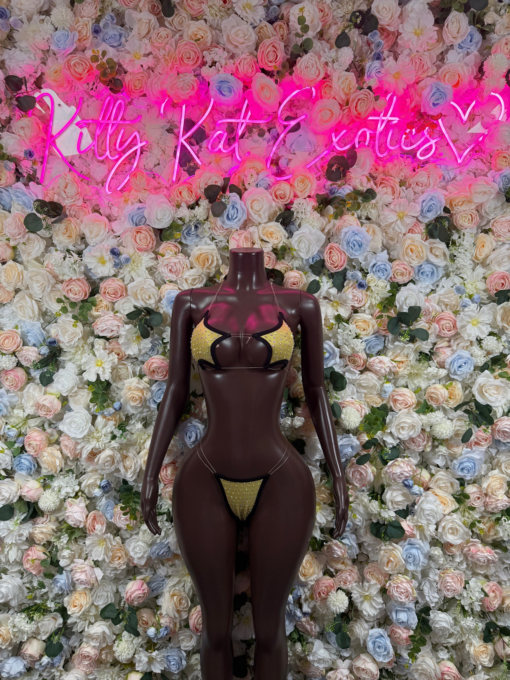 Exotic dancewear gold rhinestone bikini set – two piece stripper outfit, rave wear costume, pole dance lingerie, festival bikini