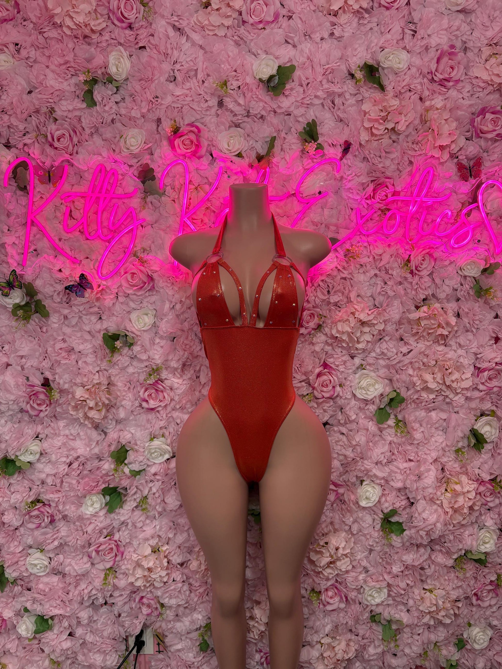 Exotic Dancewear Orange Metallic One Piece Bodysuit - Sexy Performance Costume, Latin Sultry, Bold Dance Outfit