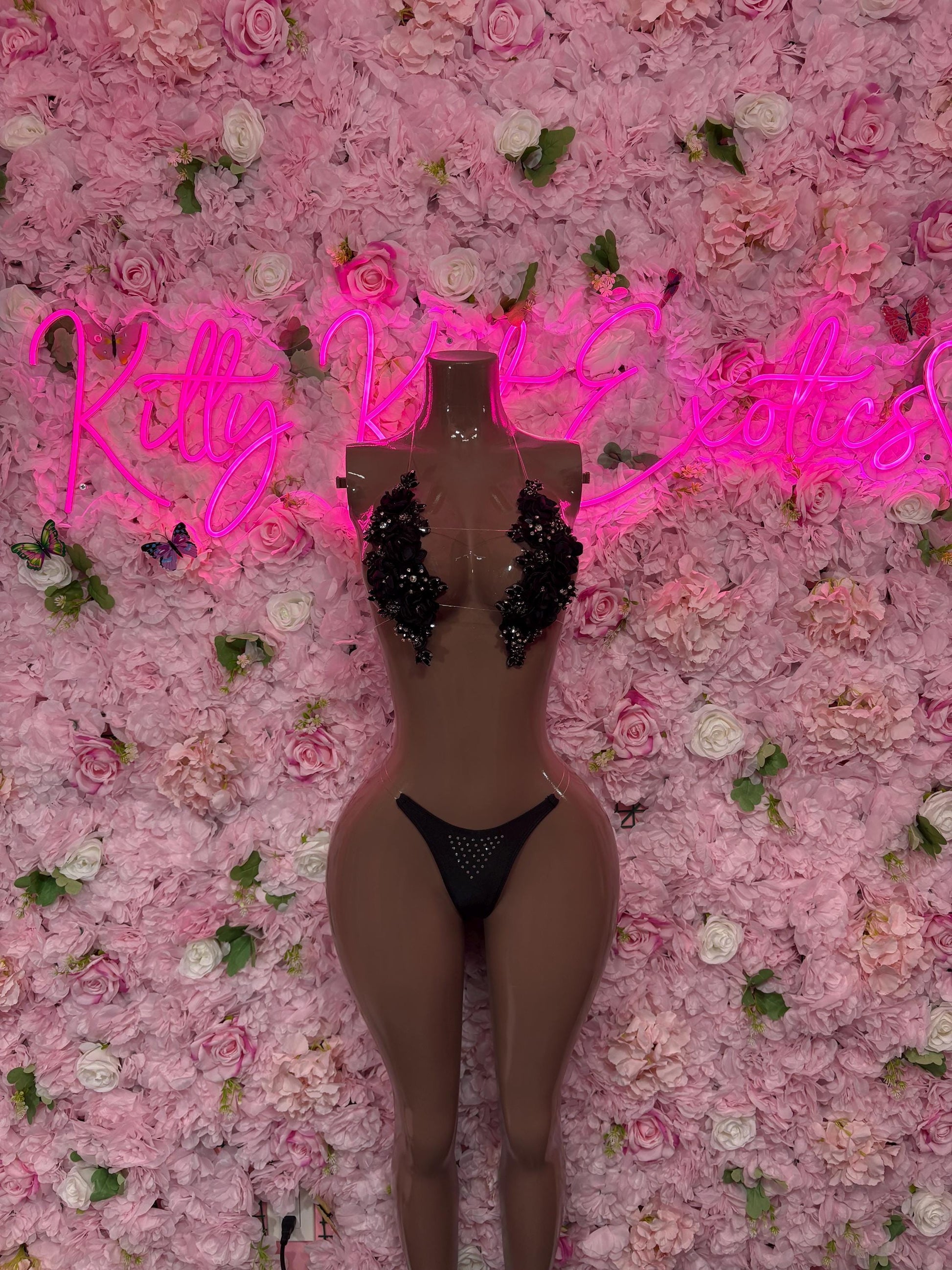 Exotic Dancewear Two Piece Black Rhinestone Floral Set Dancewear Festival Wear Exotic Ravewear Costume Performer Outfit