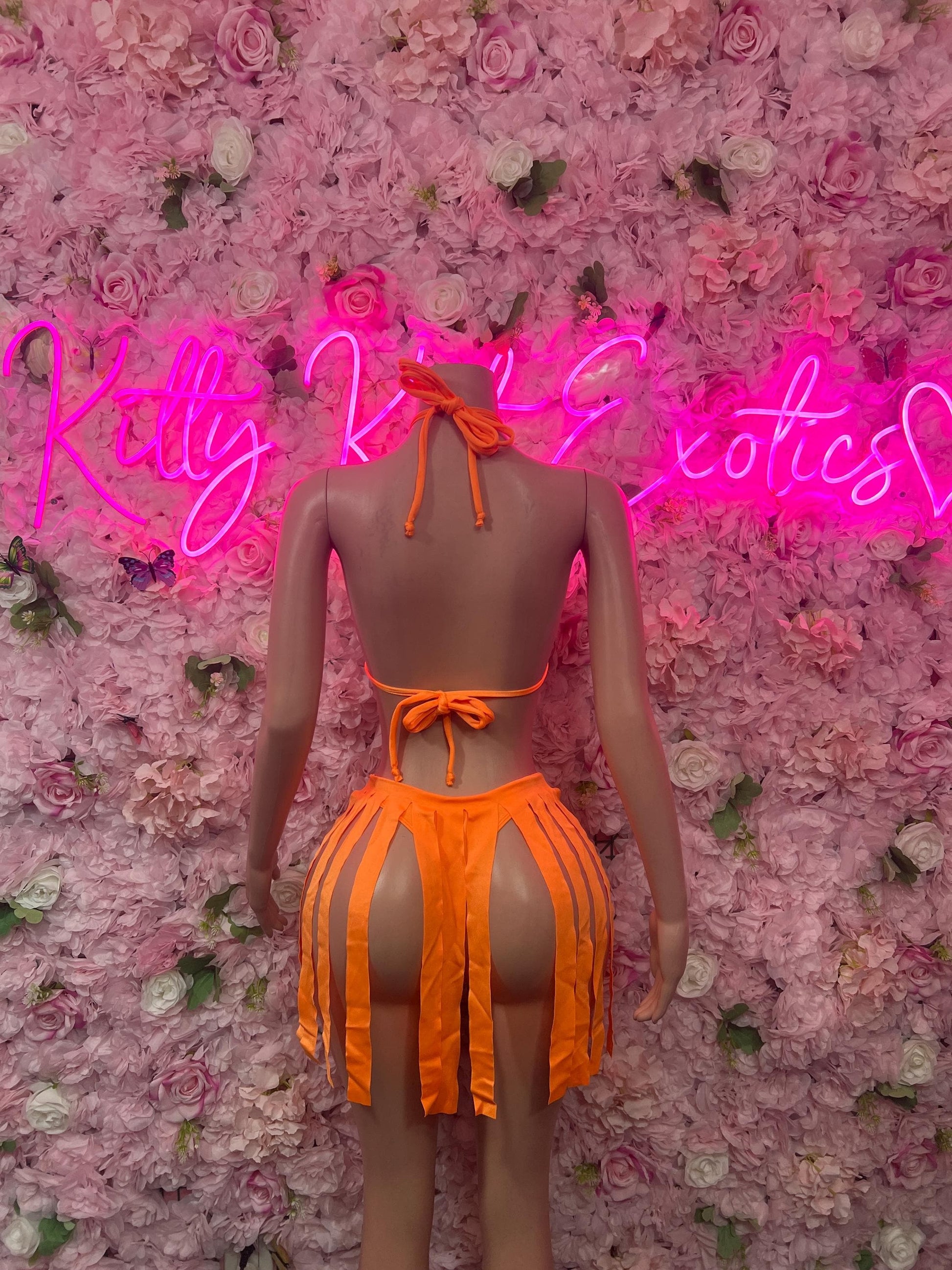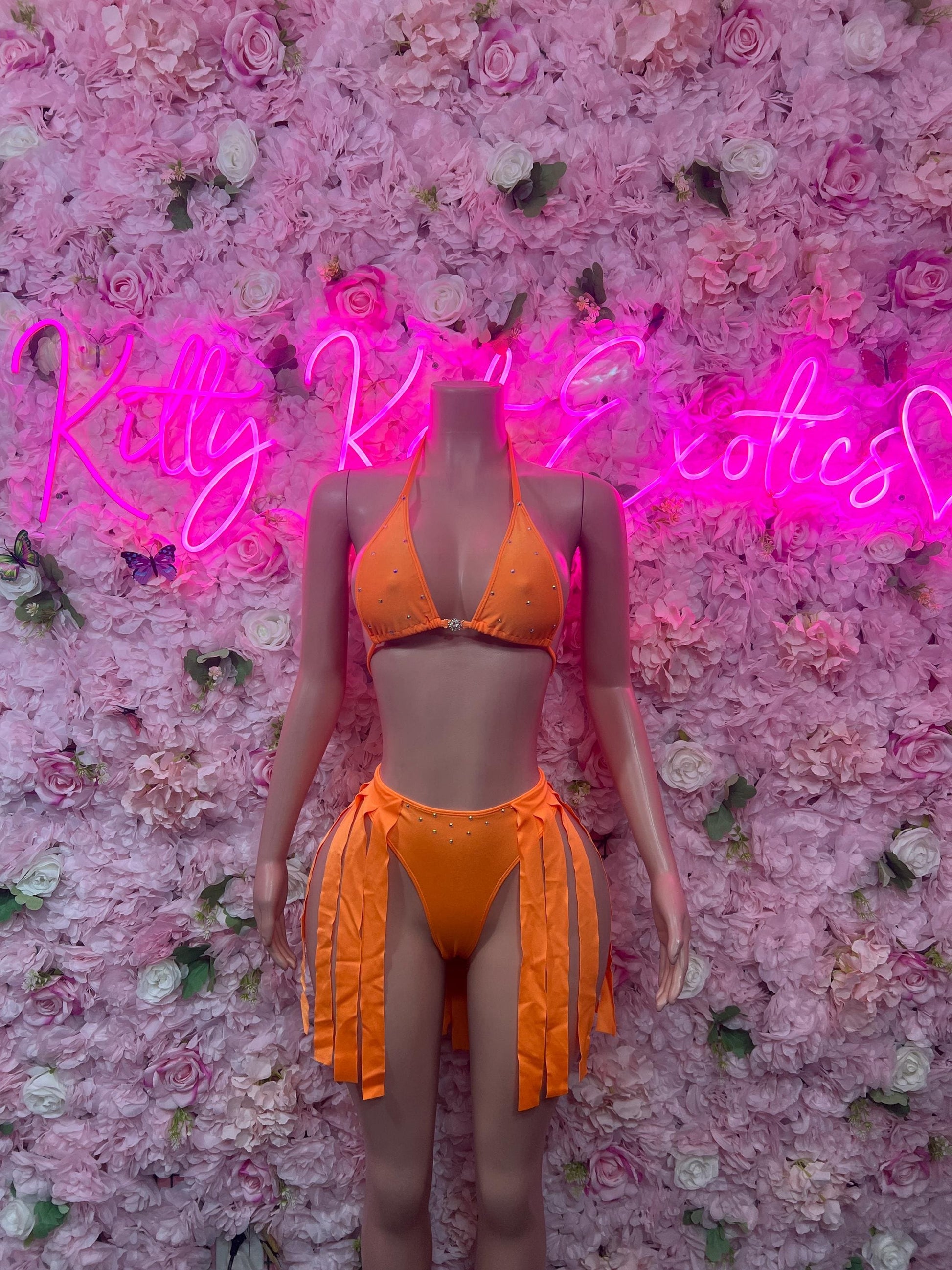 Exotic Dancewear Two-Piece Orange Fringe Exotic Dancewear Costume Sexy Festival Outfit, Rave Performance Set, Stripper & Go-Go Dancer Wear