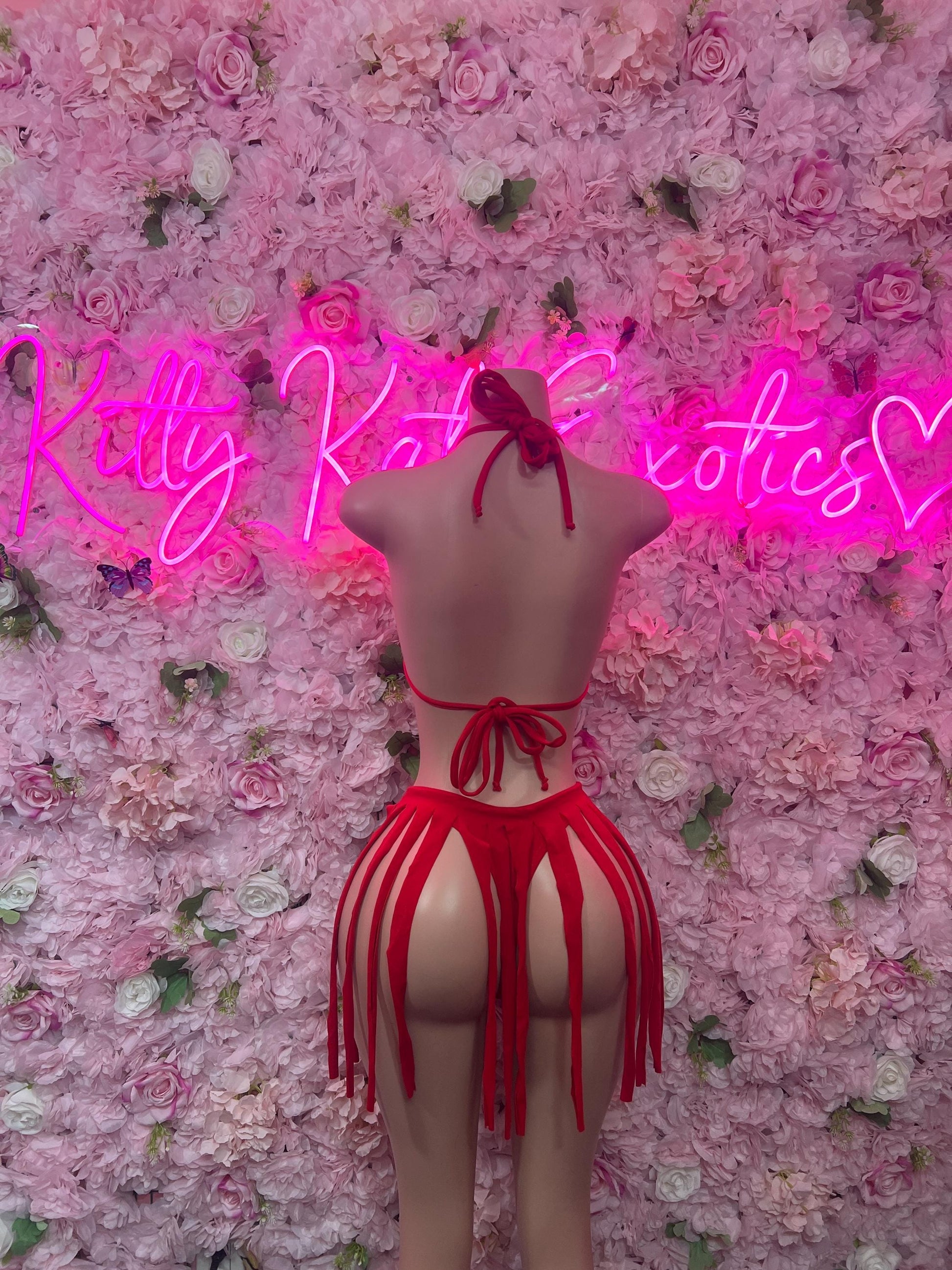 Exotic Dancewear Two-Piece Red Fringe Exotic Dancewear Costume Sexy Festival Outfit, Rave Performance Set, Stripper & Go-Go Dancer Wear