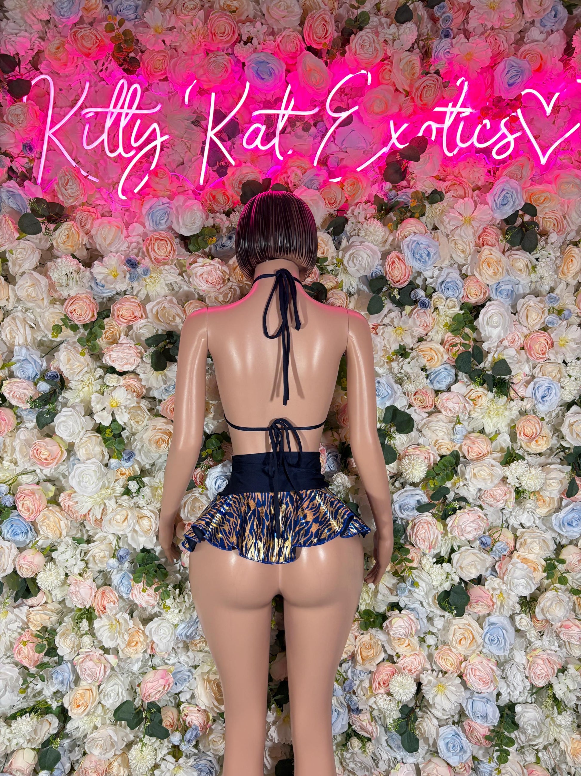 Exotic Dancewear Two Piece Skirt Set Navy Gold Tiger Print - Ravewear - Sexy Festival Outfit, Clubwear, Performance Costume