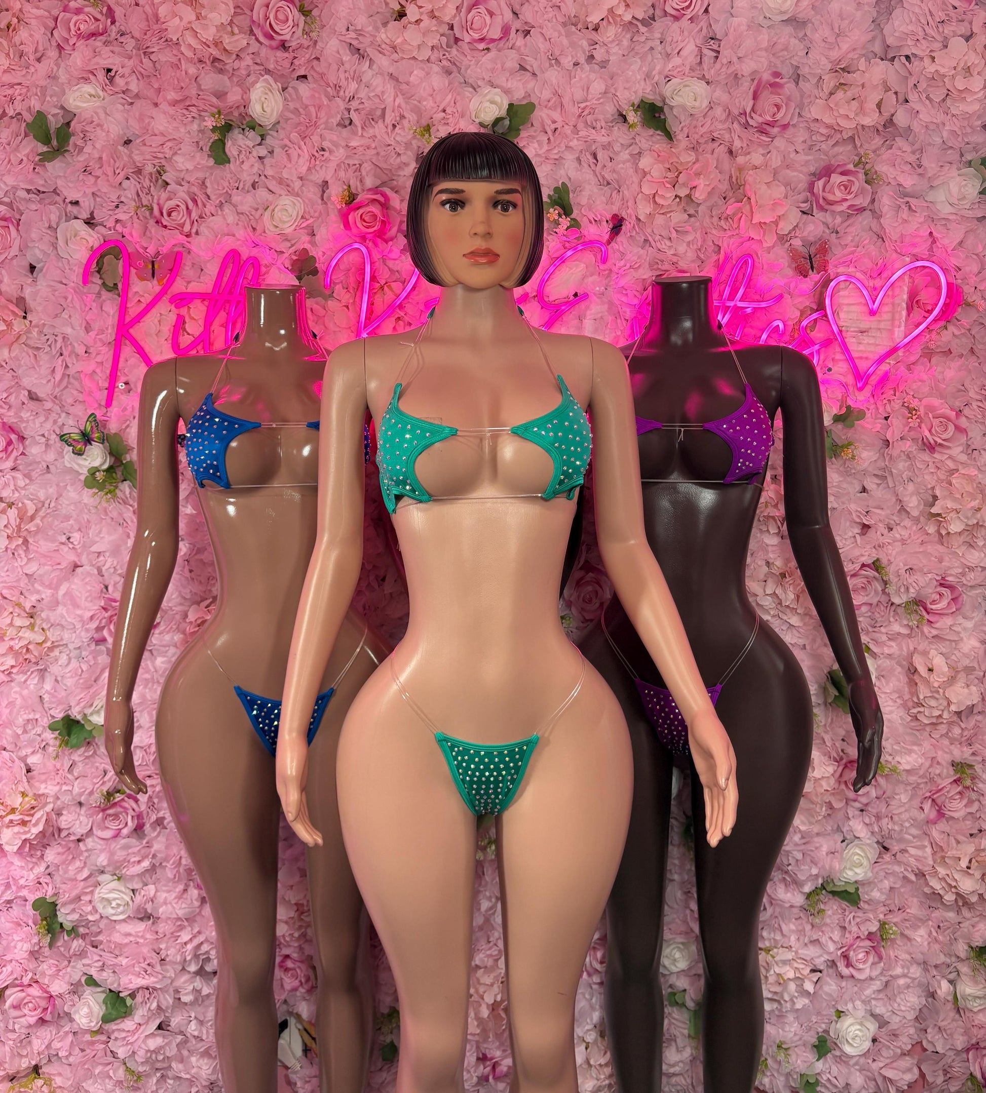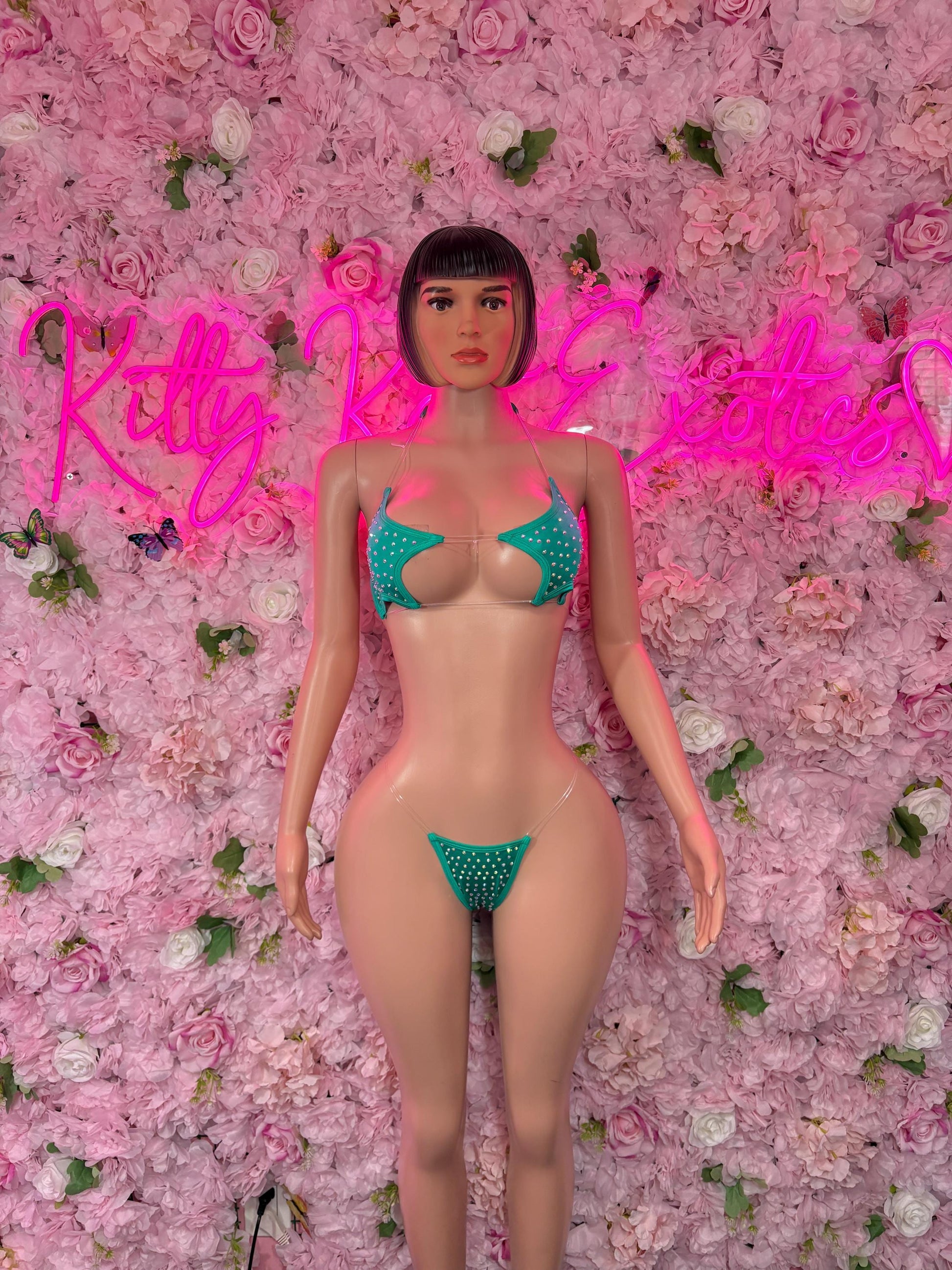 Rave Outfit Two Piece Green Rhinestone - Exotic Dancewear Bikini Set | Festival Sparkle Outfit | Stripper Clubwear | EDM Costume |