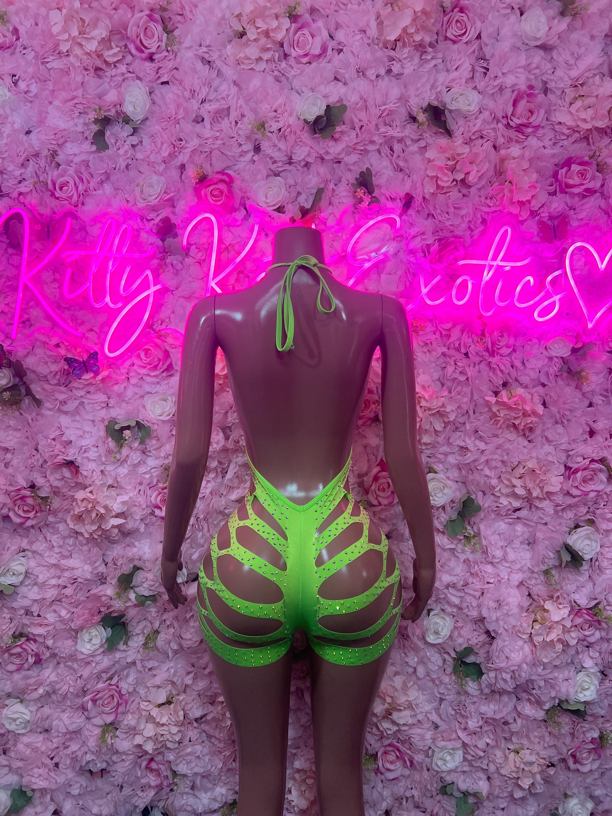 Rave Outfit Two-Piece Neon Green Rhinestone Exotic Dancewear Costume Sparkly Stripper Outfit, Go-Go Dancer Set, Festival & Rave Wear