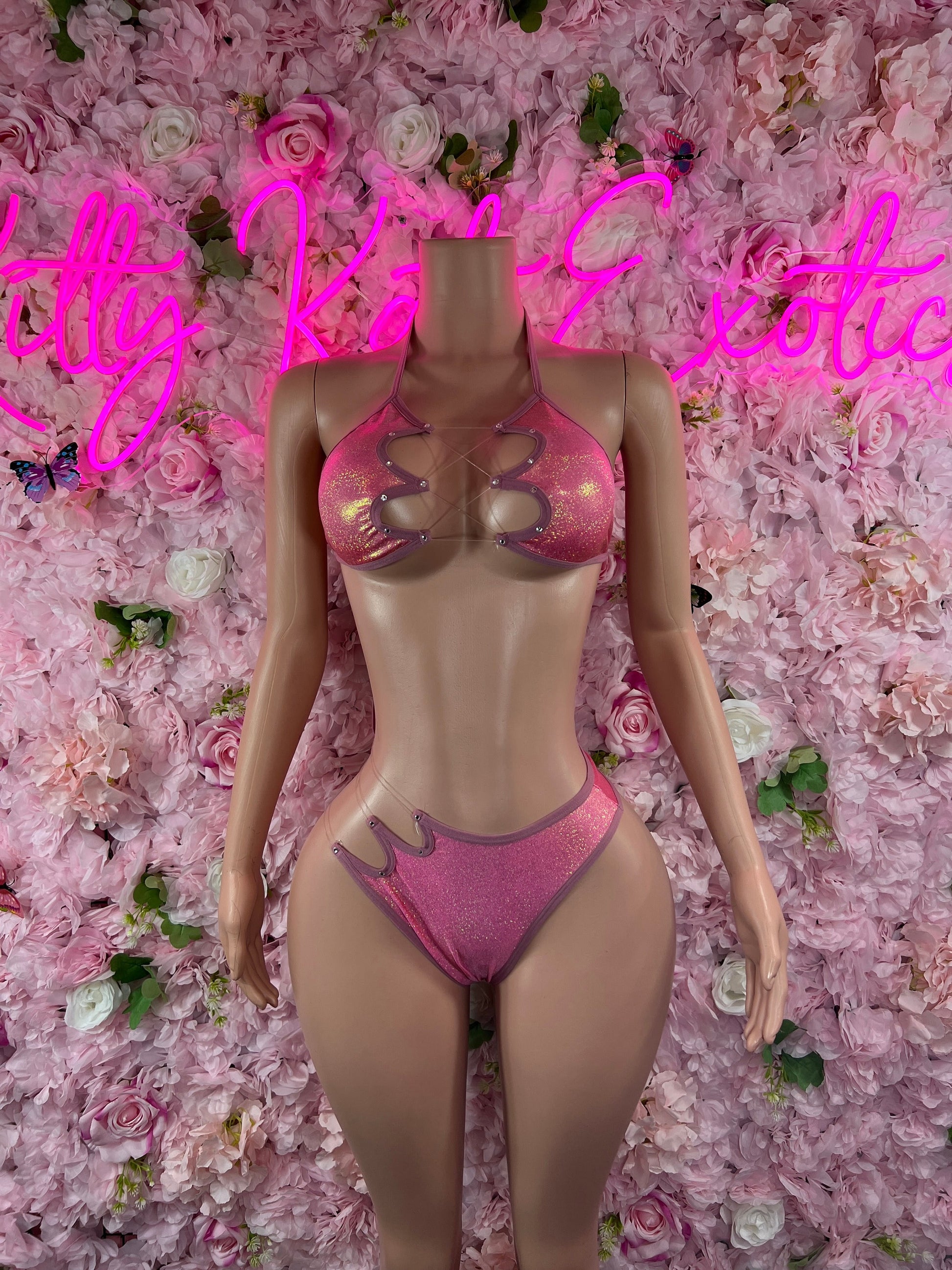 Two-Piece Pink Cut Off Bikini Cute Swimsuit Set for Beach, Pool, or Vacation | Stylish and Flattering Swimwear