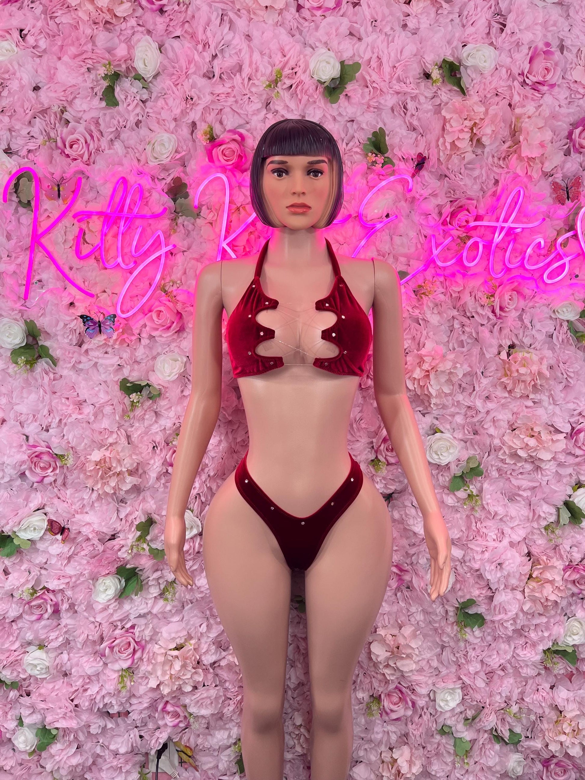 Two Piece Red Velvet Exotic Dancewear Elegant and Sexy Evening Dress for Performers, Events, or Special Occasions